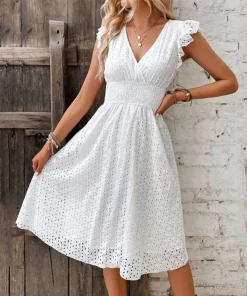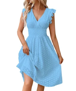 Be the first to review “Casual V-Neck Flare Sleeve Solid Color Hollow Lace Waist Beach Holiday Dresses” Cancel reply