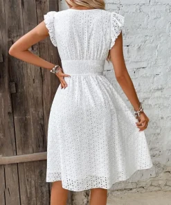 Casual V-Neck Flare Sleeve Solid Color Hollow Lace Waist Beach Holiday Dresses