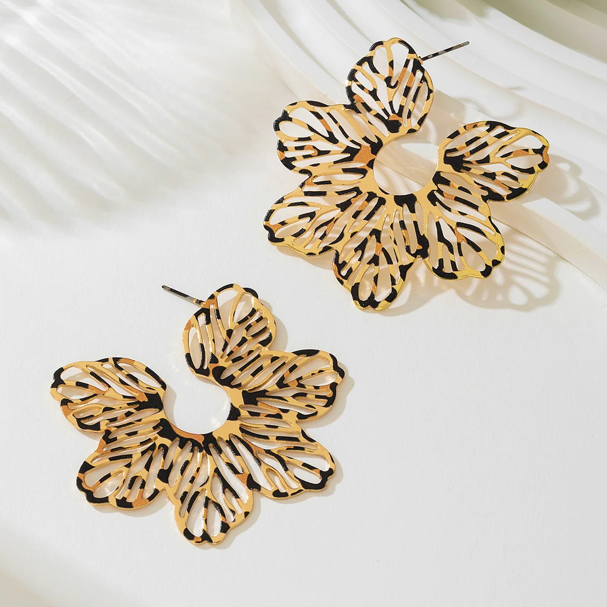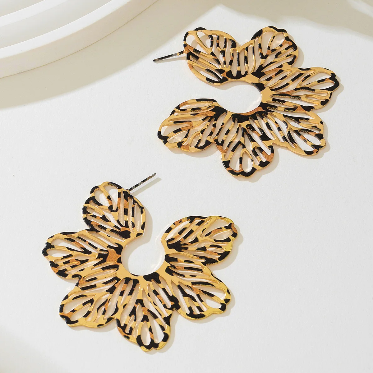 Classic Exaggerated Hollow Leopard Stud Personality Chic Gold Flower Leaf Ring Earring