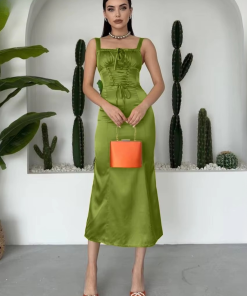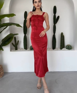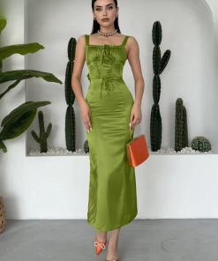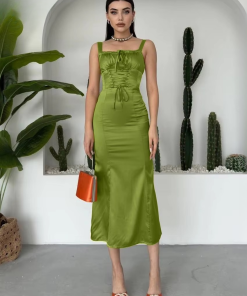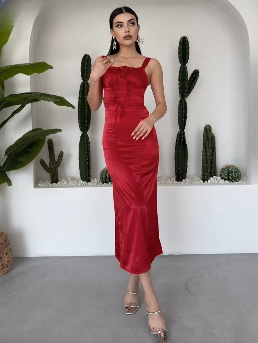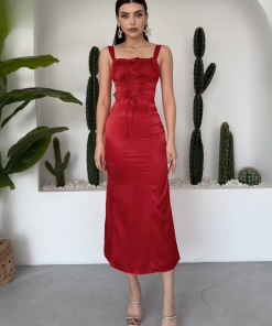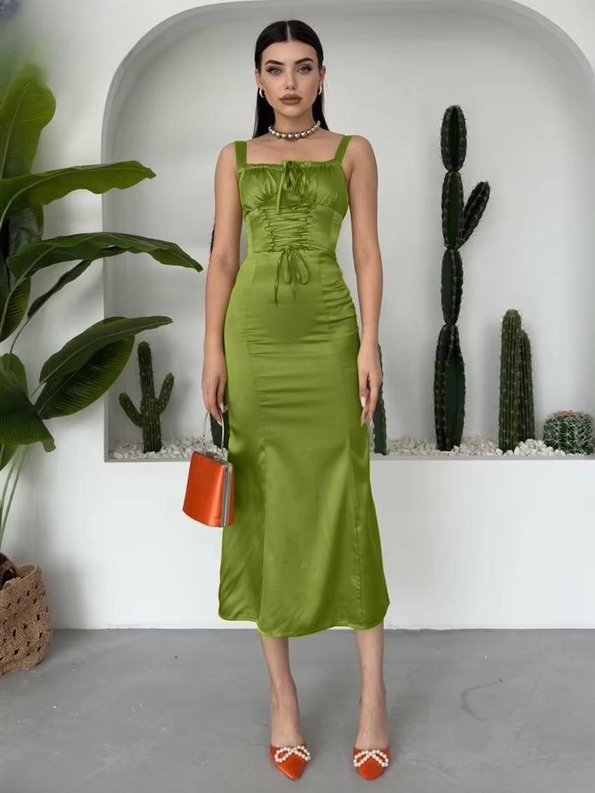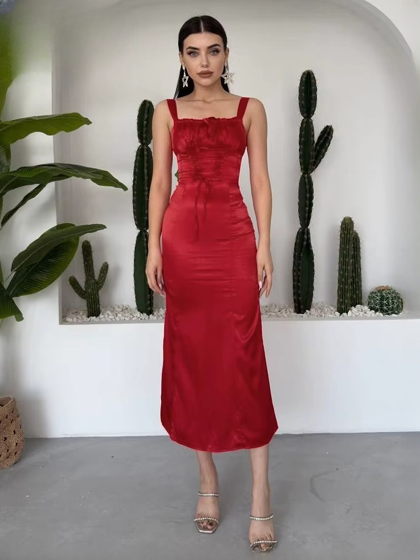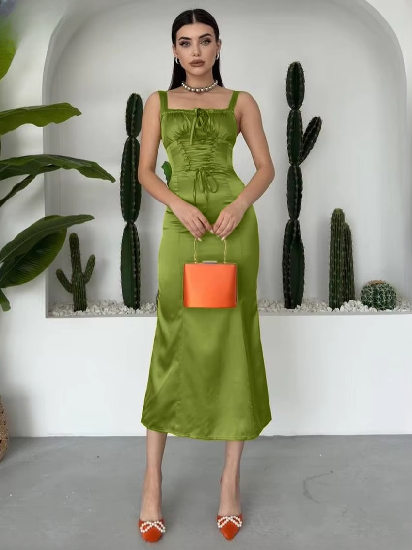 Elegant Sleeveless Classic Lace-Up Solid Satin Midi Dress
