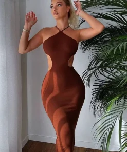 Be the first to review “Elegant Spaghetti Strap Halter Neck Sleeveless Knitted Maxi Dress” Cancel reply
