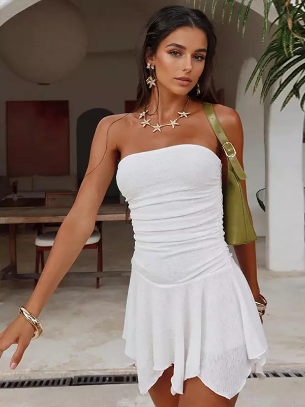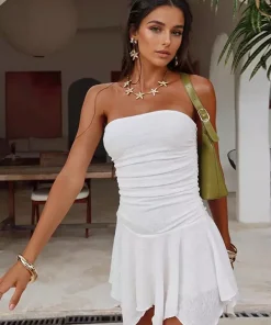 Be the first to review “Elegant Strapless Pleated Ruched With Asymmetrical Hem Mini Dress” Cancel reply