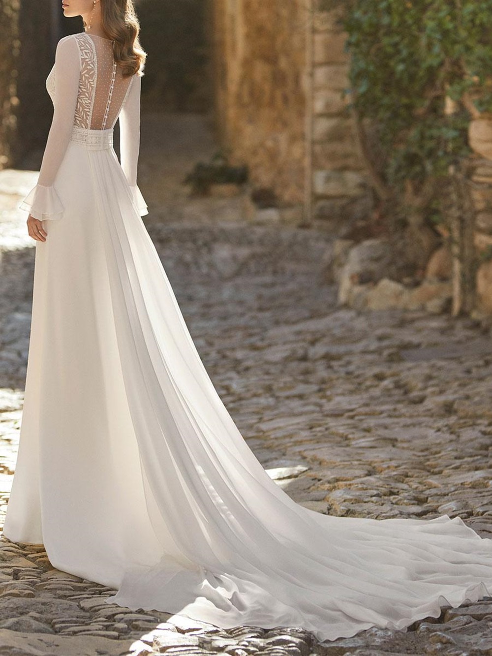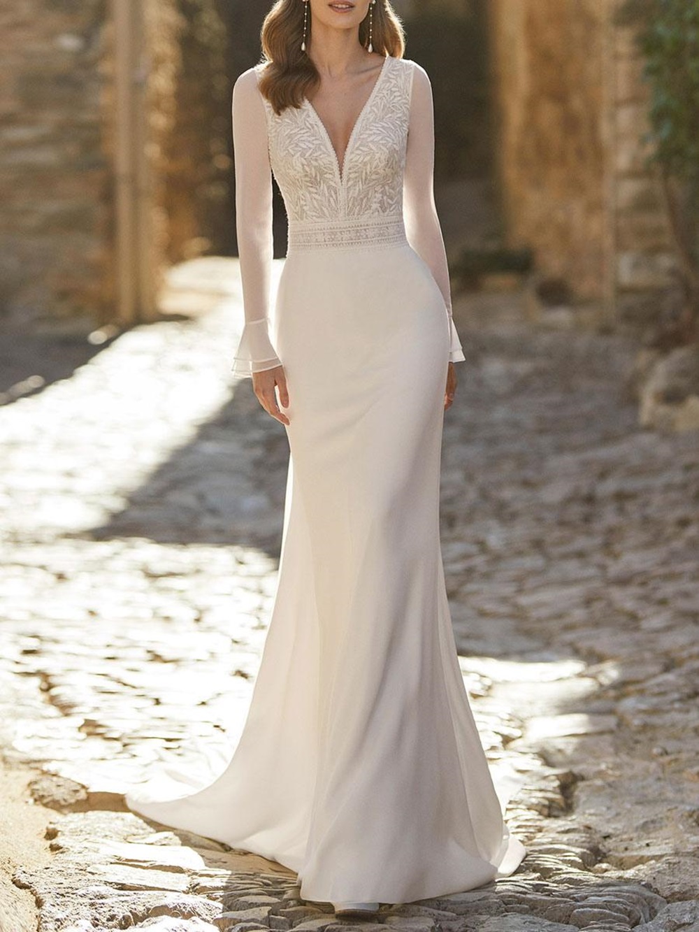 Simple Wedding Dress Lace V-Neck Long Sleeves Lace Mermaid Bridal Dresses
